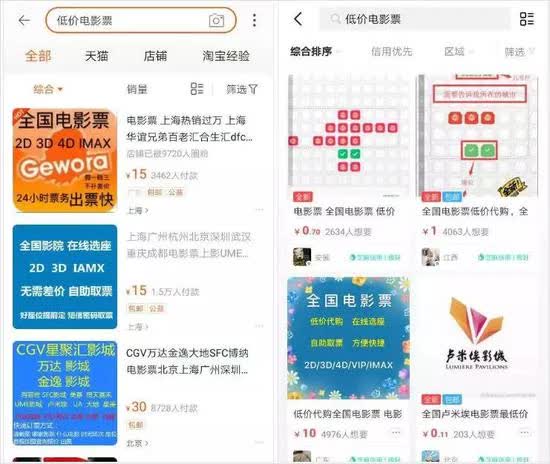 你只要打开淘宝或者闲鱼,搜索“低价电影票”,就能发现很多月销几千甚至上万的店铺。
