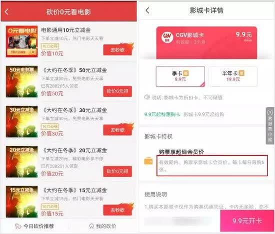 例如猫眼电影上的砍价 0 元看电影,可以通过用户间互砍获取购票代金券。淘票票上也有很多类似影城卡的优惠政策,可以每日购买 6 张优惠电影票……