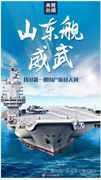 17日下午,三亚某军港内,中国首艘全国产航母交付使用。经中央军委批准,我国第一艘国产航母命名为“中国人民解放军海军山东舰”,舷号为“17”。