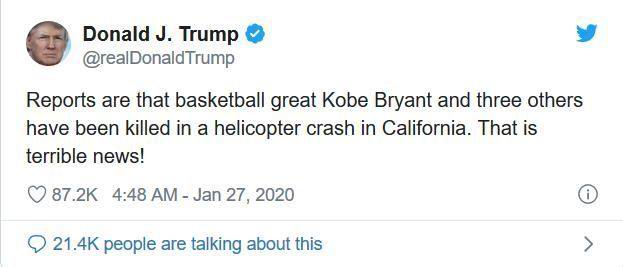 科比遇难的消息令全世界震惊。美国总统特朗普在推特上表示,"这真是个可怕的消息"。以色列总理内塔尼亚胡在推特上对科比去世表示哀悼,"听到美国发生的悲剧,我感到很难过,这对全世界所有体育爱好者来说都是悲伤的一天。科比·布莱恩特,篮球史上最伟大的球员之一,今天在加利福尼亚的卡拉巴萨斯死于一场直升机坠毁事故。他身后留下了妻子、四个孩子和世界各地数百万的篮球迷。他不会被忘记。愿他安息。"
