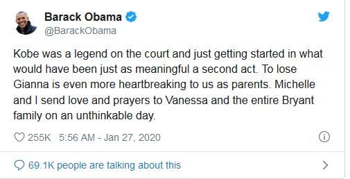 美国前总统奥巴马在推特上发文悼念科比:"科比是球场上的一个传奇,他人生的第二幕才刚刚开始。失去吉安娜(科比女儿)对作为父母的我们来说更令人心碎。在这不可思议的一天,米歇尔和我向瓦妮莎和科比全家致以爱与祈祷。"