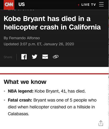 » 2020真是噩耗连连:篮球巨星科比坠机去世