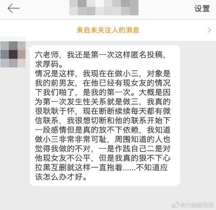 @六层楼先生:姑娘,非常感谢你的信任,同时承认自己在「做小三」是需要勇气的。