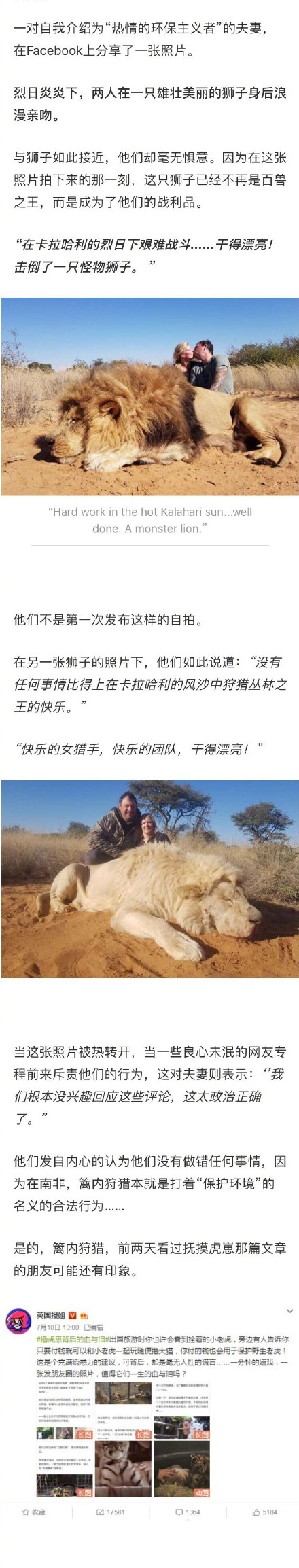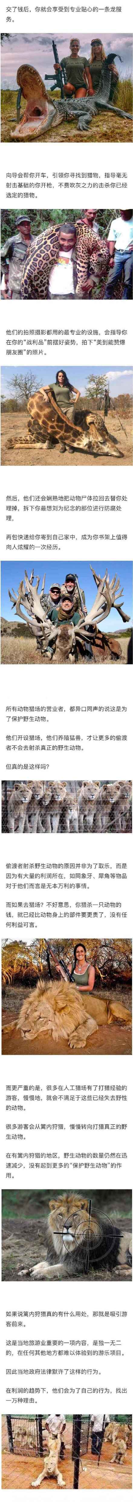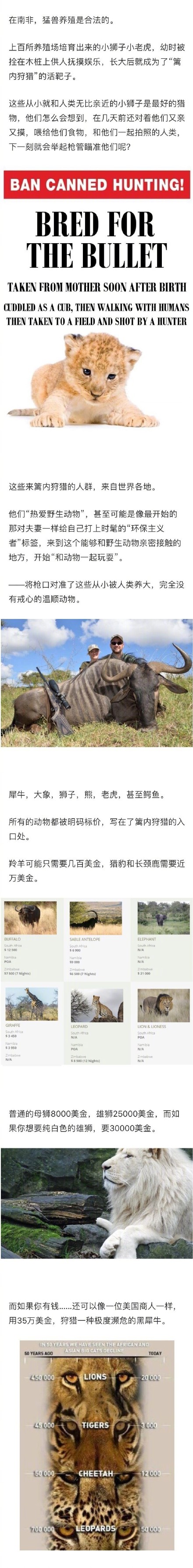 @英国报姐 :在这里,所有动物的生命都被明码标价。只要付得起钱,就可以亲自猎杀极度濒危的猛兽,在尸体前自豪拍照,将战利品合法带回国,成为自我吹嘘的点缀。南非的#篱内狩猎#,一个用动物的生命满足游客嗜血欲望的残忍产业链…… via