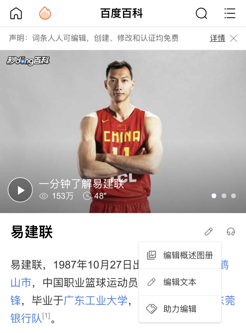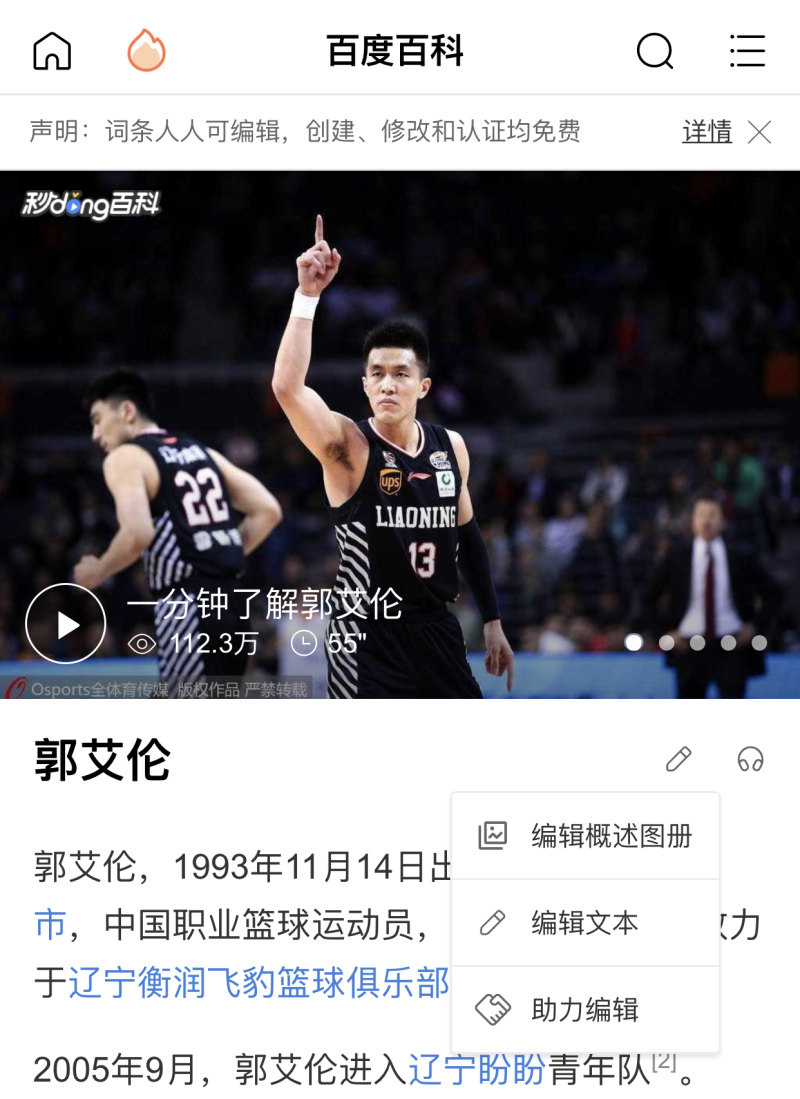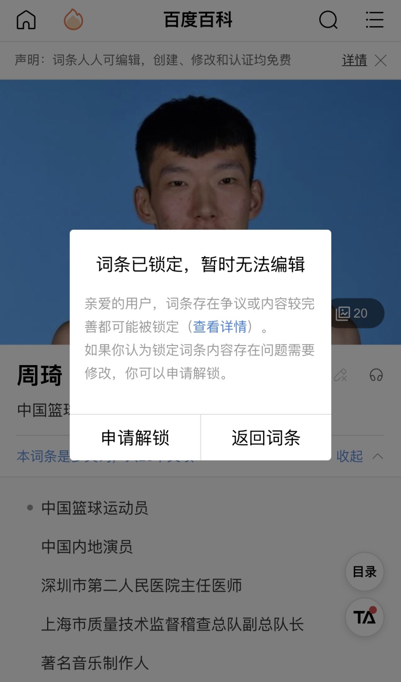 早上看周琦的百度百科词条被锁定不能编辑了!看了下其他球员的包括阿联和郭艾伦的都是可编辑状态。