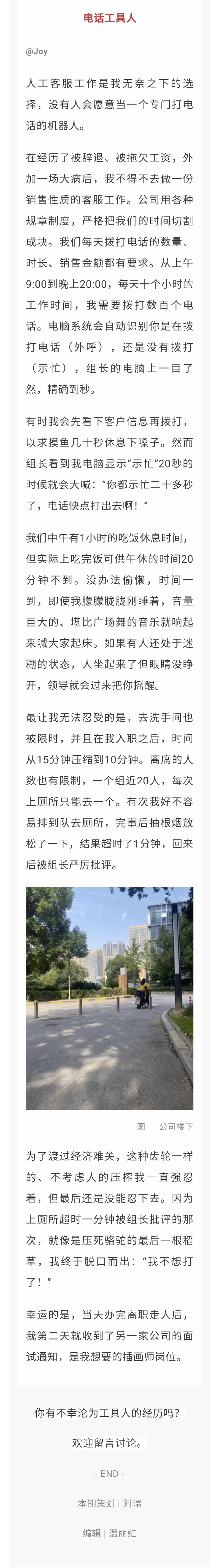 “工具人”是指人被当成了达成某种事情的手段,而不是目的。互联网大厂中被限制厕所时间的“996”社畜;电脑系统里休息时间以秒计算的银行客服……当代人会在各种情景中陷入“工具人”困境,作为人的各类需求不再被考虑——毕竟没有人会在乎一个工具会不会累、需不需要夸奖。