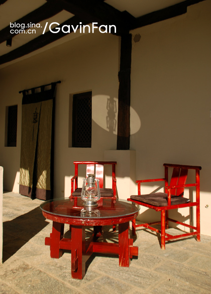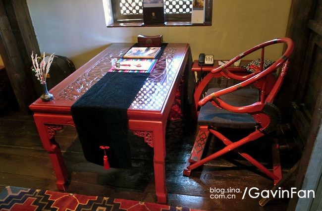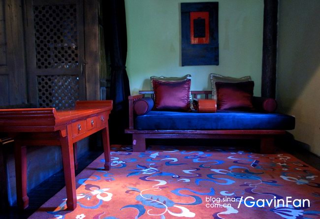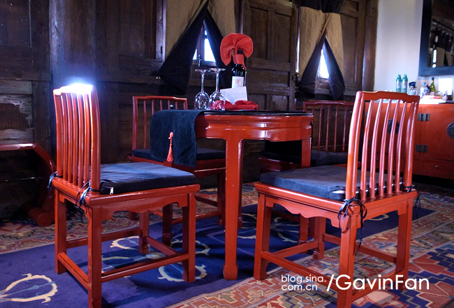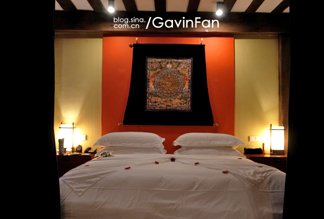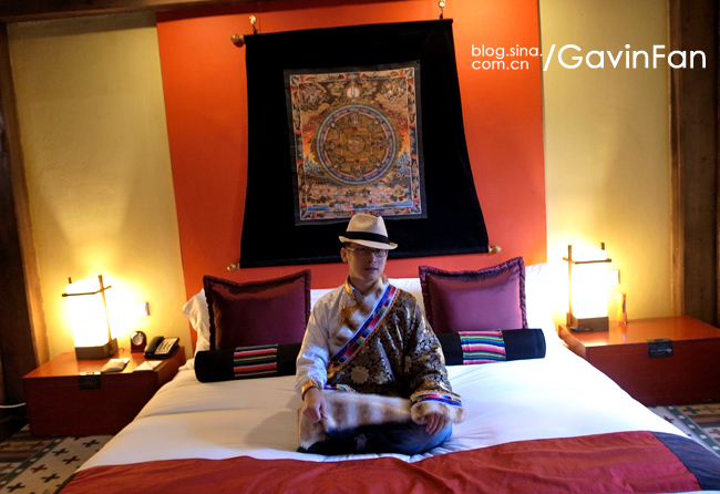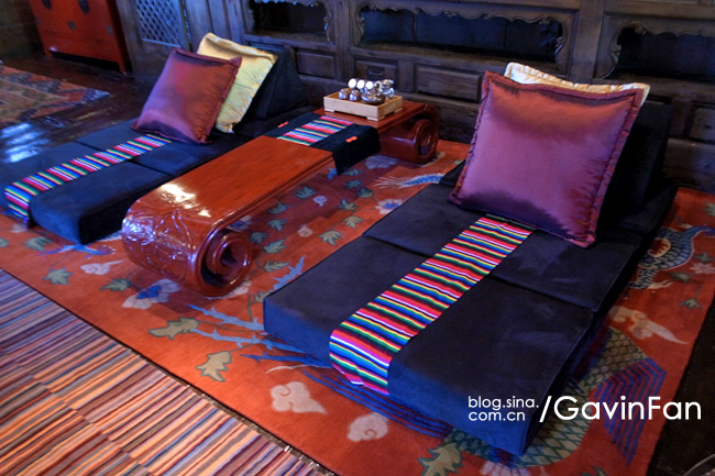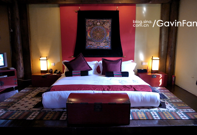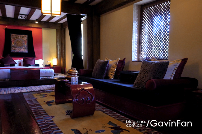 首先是超级大,家居的主色调是红色,阳光透过格子窗棂,游浮在空气中。最夺人眼球的就是那张床,床头悬挂着唐卡,床尾是一张藏式的看起来很有年头的红箱子,床上的欢迎字样,居然是拿松针拼成的。除了床以外,这个大空间还有三个小憩的区域,分别是沙发,藏式榻榻米,以及一张高榻。屋子的中央,是一个藏式的取暖用的火塘。门的左侧是MINI BAR和餐桌,右侧则是书桌。屋子里大大小小的地毯更是好几块,整个房间真是极尽繁华之能事,但高明就高明在,它是低调的繁华,看起来一点儿也不乱。