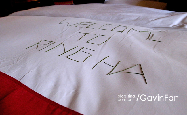 床上,松针拼成的欢迎辞。