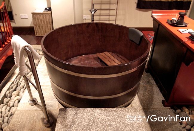 中央有一个圆形的木式浴盆。