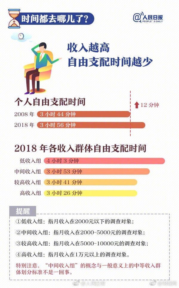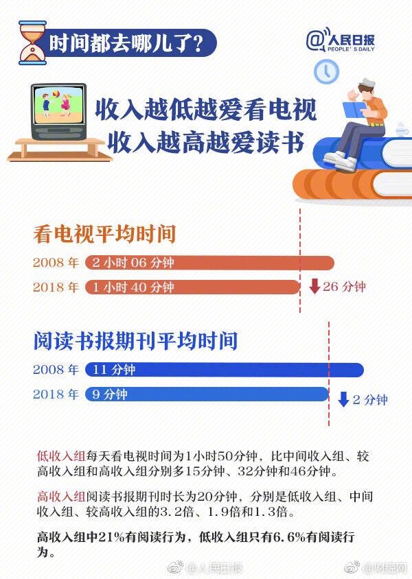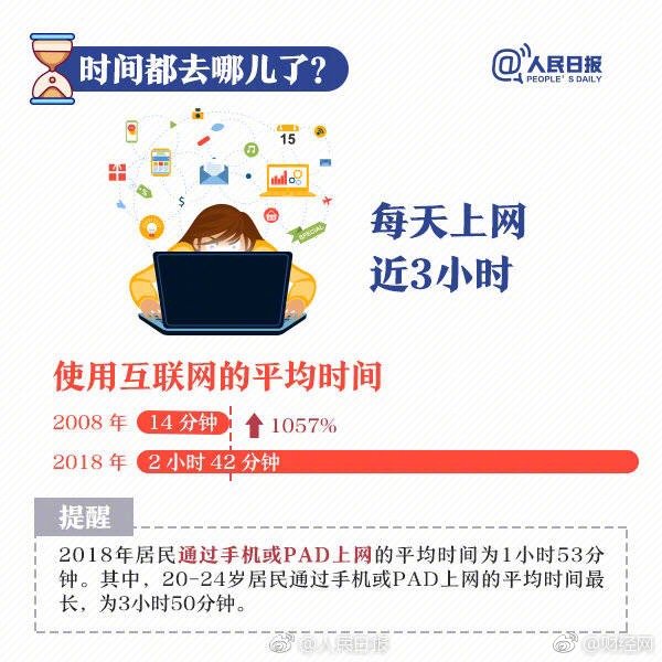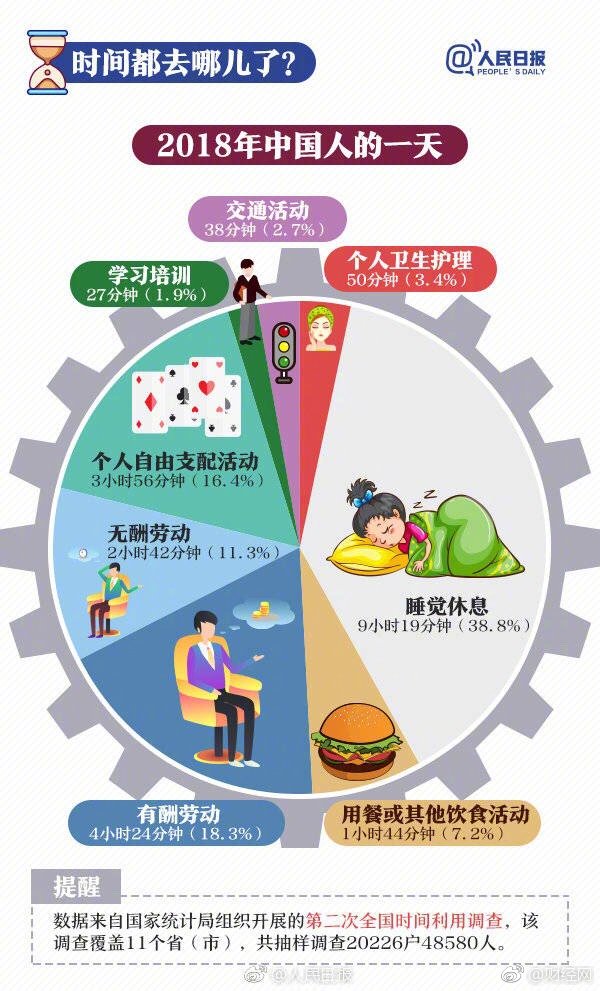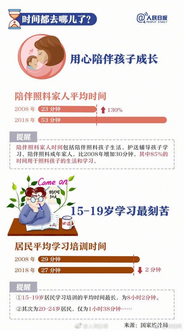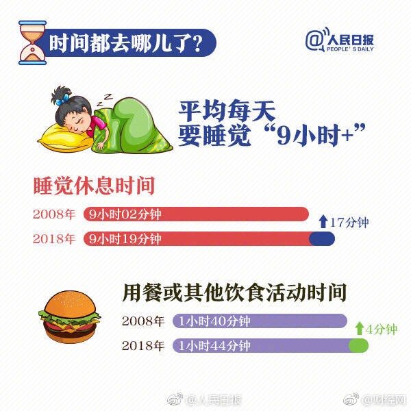 近日,国家统计局发布2018年全国时间利用调查公报。数据显示,我国居民每天上网近3 小时,睡眠时间超9小时,收入越高越爱读书…与2008年第一次调查数据相比,十年间我们的时间分配还发生哪些变化?戳↓↓你的一天是这样度过的吗?