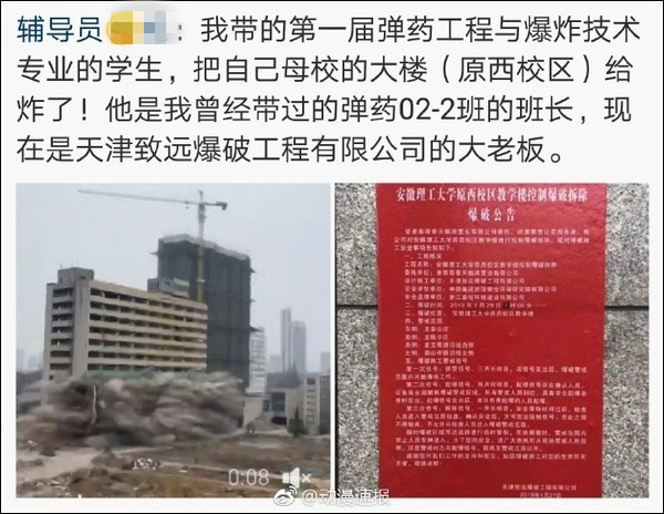 昨天安徽理工大学原西校区教学楼实施爆破作业后,该校一名辅导员的社交平台内容截图火了。