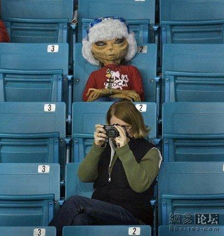 北京时间2009年4月8日,男子冰壶世界锦标赛继续在加拿大蒙克顿进行,一位打扮成ET的观众,穿着印有“加拿大火箭”字样的T恤,坐在看台上平静观战,周围的其他观众则是见怪不怪。