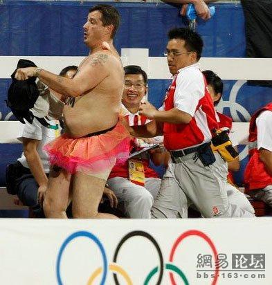 2008年8月21日晚,在香港举行的奥运马术项目比赛进行最后一天赛事,场內一观众着奇裝跑入赛场,被保安驱赶出场。