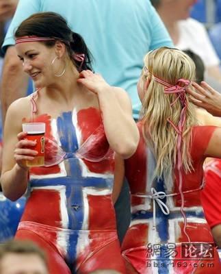 06世界杯时,两位英格兰球迷身上遍涂英格兰国旗,为自己支持的球队助威。