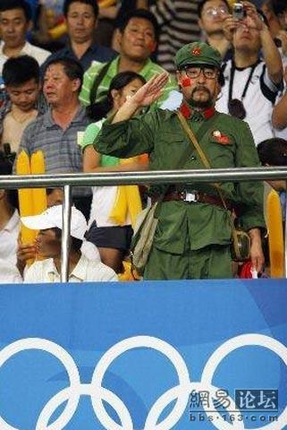 北京奥运会上,一位观众的“怀旧军装”造型吸引了不少人的注意。