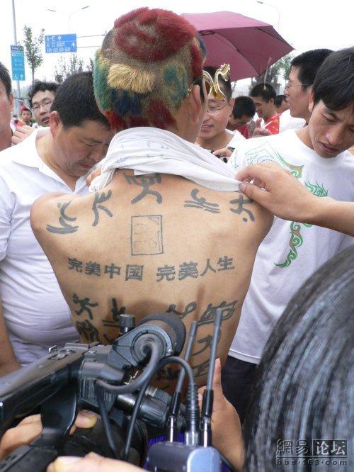为了表达对于北京奥运会的支持,观众们各想奇招。这位比较狠,基本上把所有奥运会的标志都纹上去了。