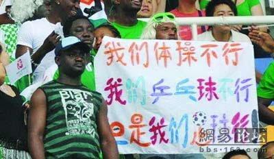 虽然战绩不佳,但是国足在北京奥运会上却是绝对的明星。男足半决赛尼日尼亚球迷打出的标语估计够让国足羞愧一阵子了。