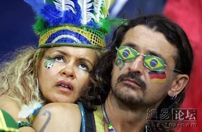 06世界杯巴西不敌法国被淘汰出局,不知道是不是因为输球难过,这位球迷干脆把眼镜给涂了,估计他来这就不是看球的。