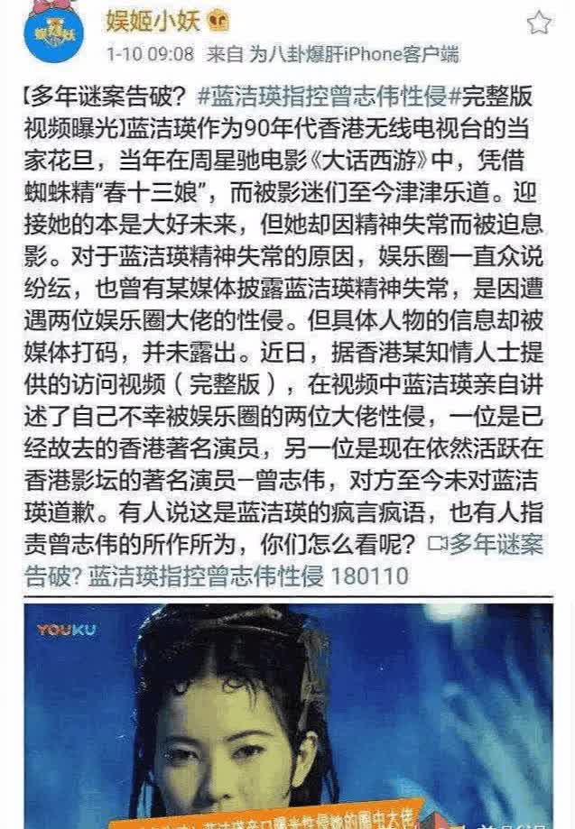 年初卓伟的“周三见”爆出了蓝洁瑛采访的未消音版本,清楚的确定了当初侵害蓝洁瑛的两位香港大哥,一位是已经故去的邓光荣,一位是仍然活跃于娱乐圈的曾志伟。