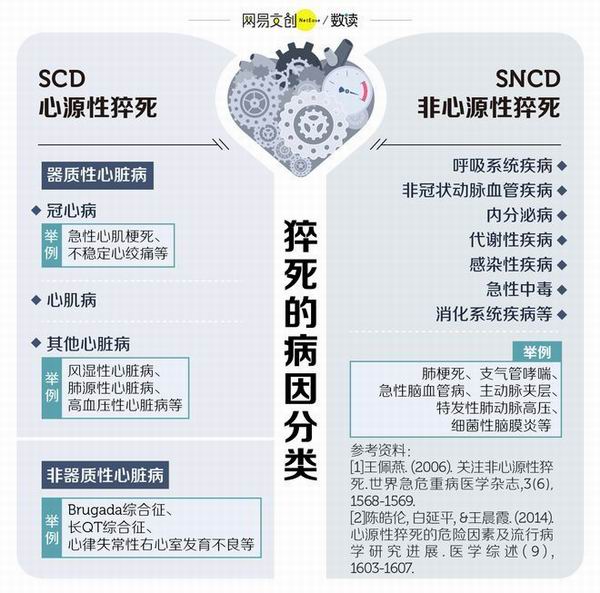 作为突发性的非预料死亡,猝死包括心源性猝死和非心源性猝死,前者占全部猝死近80%,后者占约20%。.心源性猝死,指的是心脏病导致心脏骤停引起猝死。非心源性猝死则病因众多,几乎身体的每一系统、每一类疾病都可能导致猝死。
