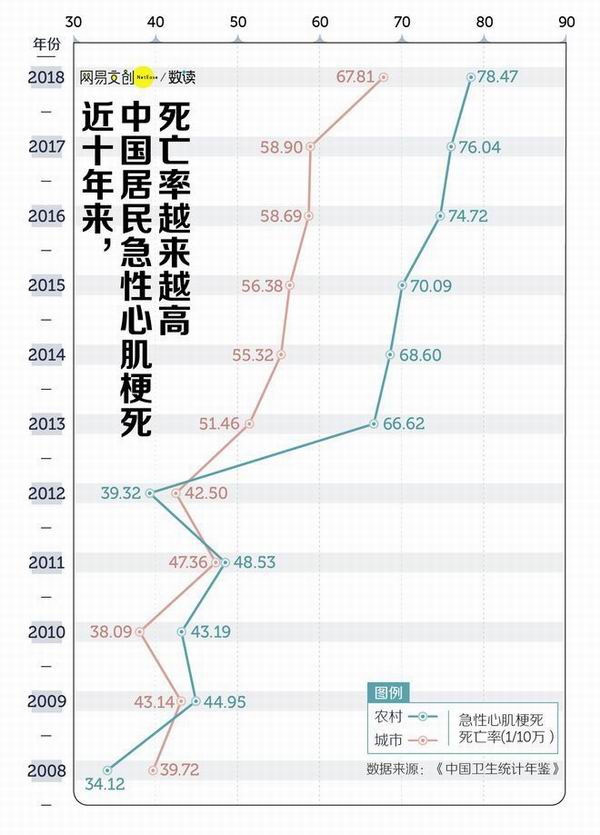 近十年来,中国城乡居民急性心肌梗死死亡率越来越高了。虽然在中国,心肌梗死患者的平均年龄是62岁,但它的发病却逐渐年轻化。