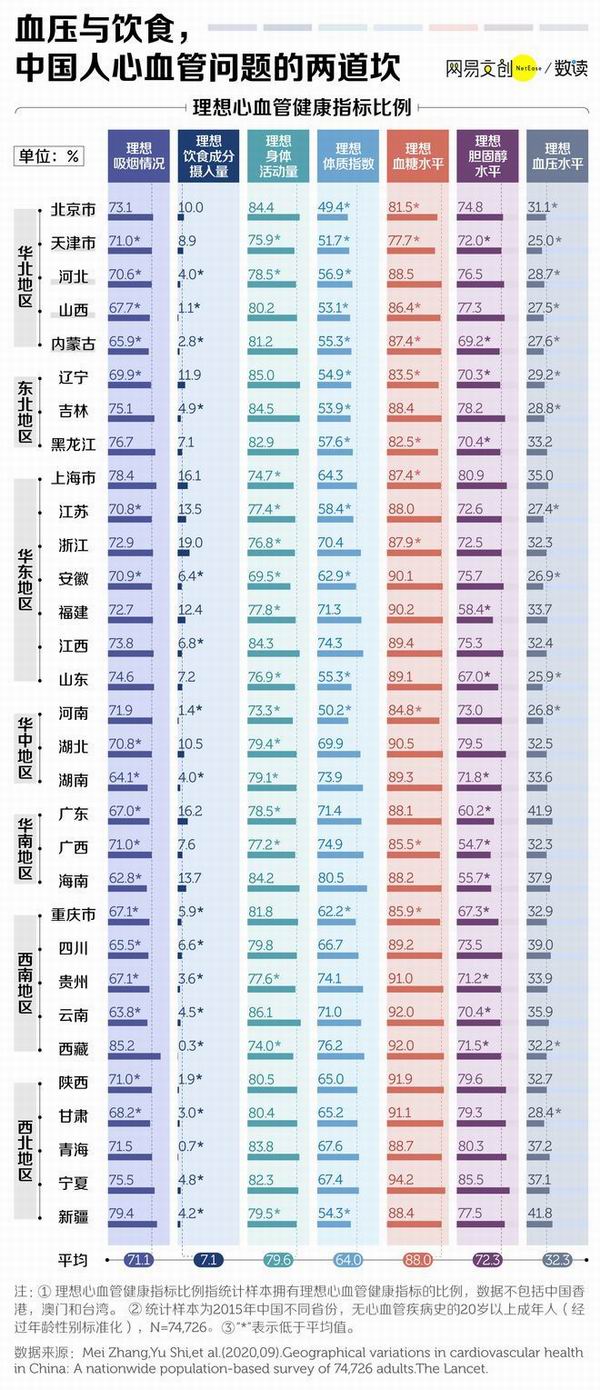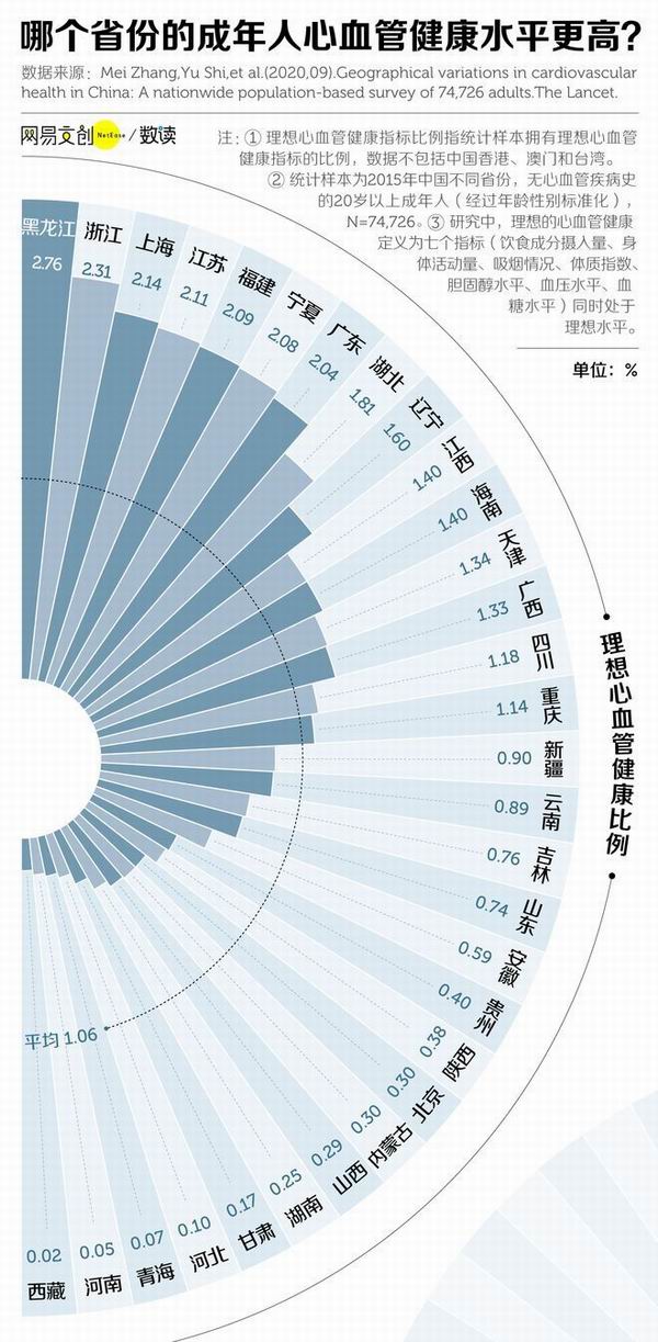 今年9月,国际权威医学杂志《柳叶刀》发表了一篇针对中国心血管健康地域差异的研究,按省份确定了七个心血管健康指标在无心血管疾病史的成年人(≥20岁)中所占的比例。