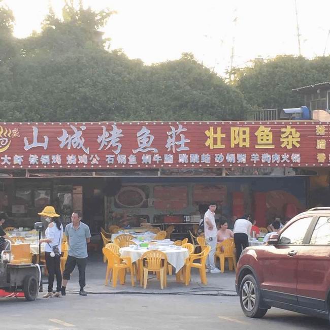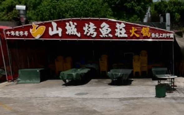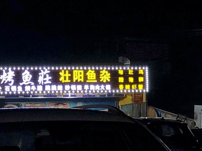 最边上,便是即将要出场的主角--壮阳鱼杂。在这个红板上,".山城烤鱼庄"是它的店名,但旁边标注着的"壮阳鱼杂"却在不经意间抢走了所有风头: