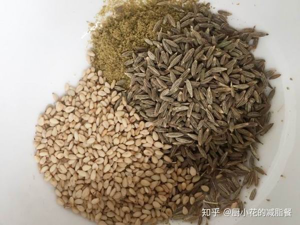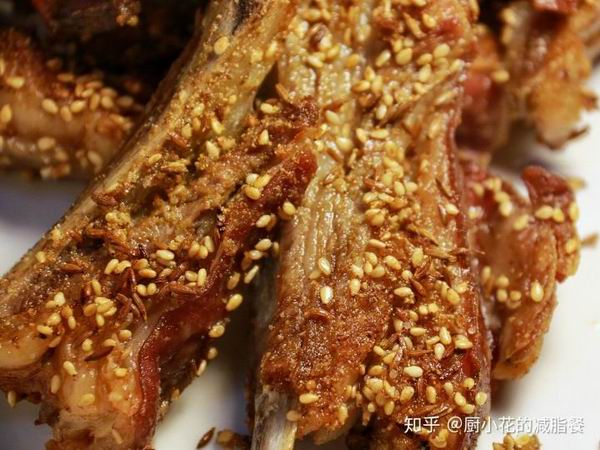 碗里抓一大把孜然粒,一大把孜然粉,一大把白芝麻,混合均匀,拿起刷子,当然用手撒也是可以的,给每根羊排撒料,翻过来继续;