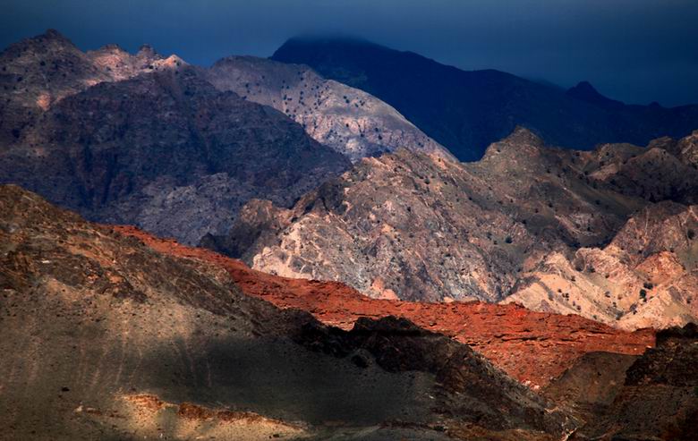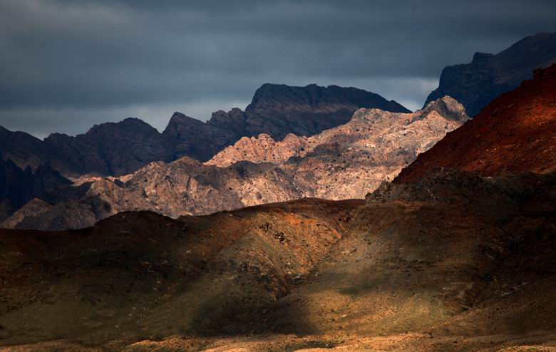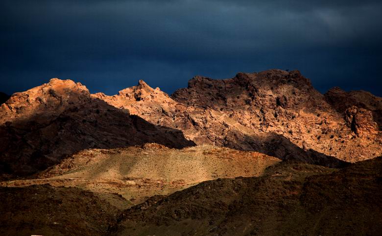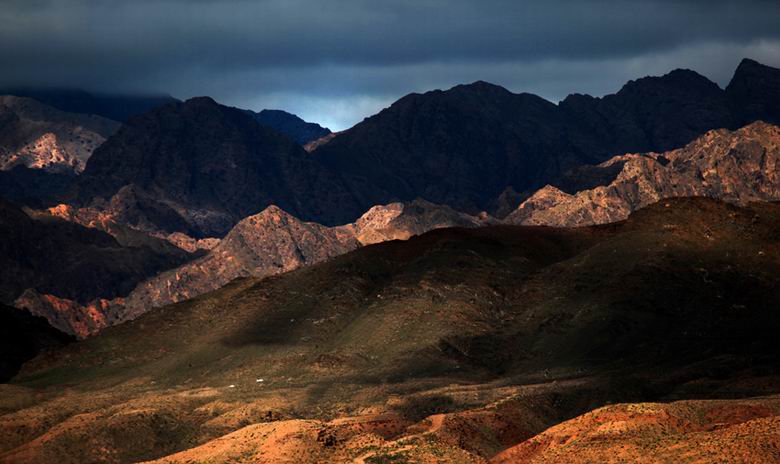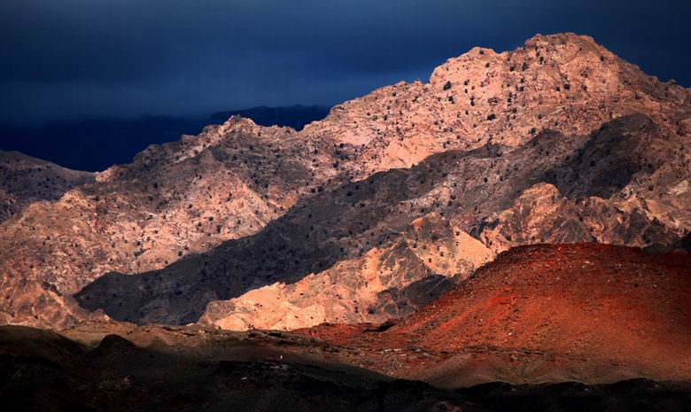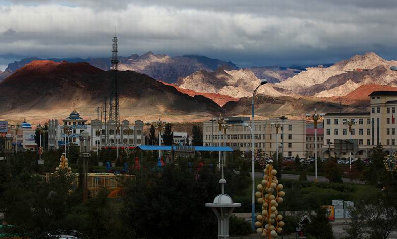 乌拉特后旗北面的高山属阴山山脉,这里的一段叫狼山,狼山物产丰富,山里有铜、铁、金、银、煤、硫、铅、锌、稀土、石墨、石灰石、硅石等矿产,山的颜色因为矿属的不同而呈现出不同的色彩,在早晨阳光的照射下非常艳丽。