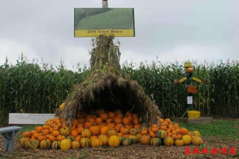 ↓农场里还有这种玉米杆组成的迷魂阵,有点像八卦阵,走进去看看上面的图,不然很难走出来;再看看这些可爱的南瓜,那么大一遍,很激动人心