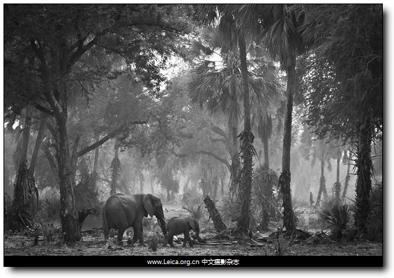 拍摄作品:赞比亚国家公园中的母象与小象。