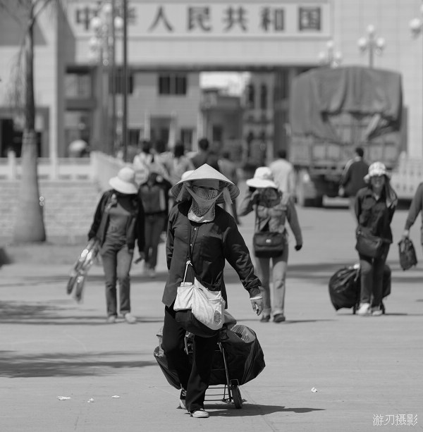 一群越南妇女正吃力地携带大包小裹返回越南口岸