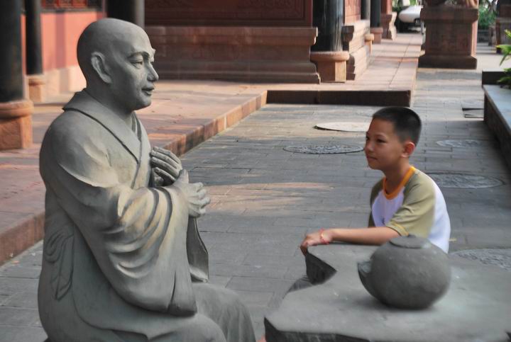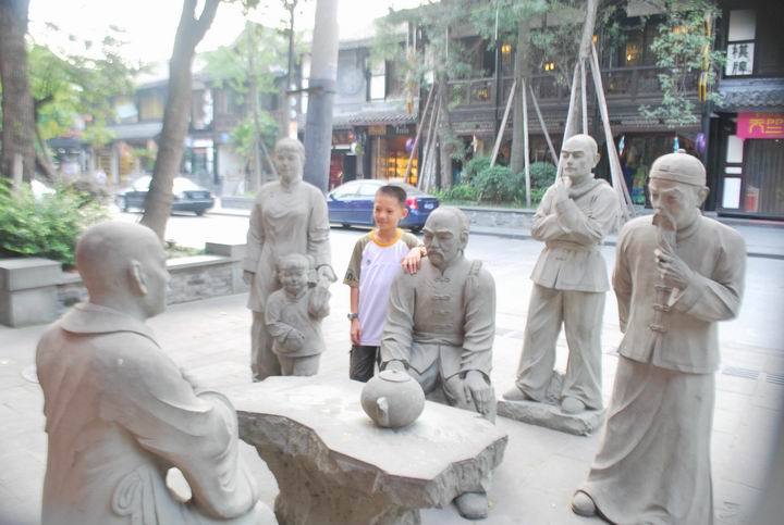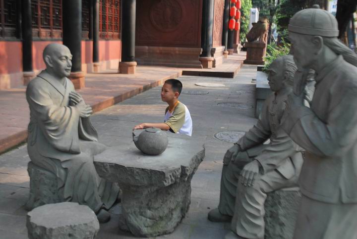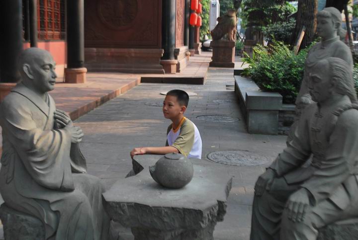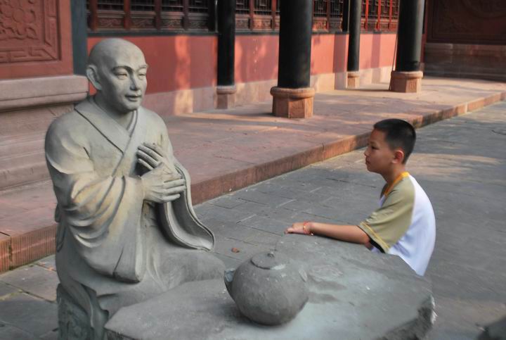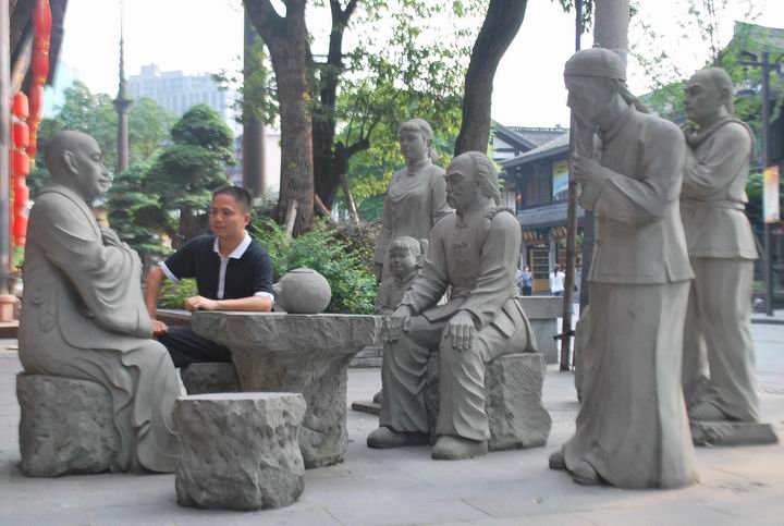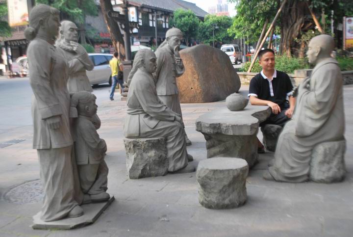 来成都之前,世森曾对我说,在关中、巴蜀一带的市井乡野,往往会遇到一些其貌不扬的老者,其实竟是满腹经纶的博学鸿儒。从眼前这普通老者给我们讲了一番如此深奥的佛理,再次让我体会到了什么叫文化底蕴,什么叫历史积淀。想到在我们的广东的某些经济发达地区,因被揶揄为文化沙漠,便大张旗鼓地重资兴建起金壁辉煌的图书馆、文化展厅,煞有介事地请文化学者来开坛讲学,隆而重之,一个比一个排场大,却始终未见得因此便多了些许“文化”。可见,“文化”这事不是一朝一夕可以成就的,必须有历史积淀,必须走进了市井,广泛扎根于群众,才会有源泉和生命力。