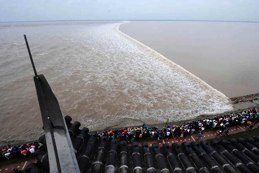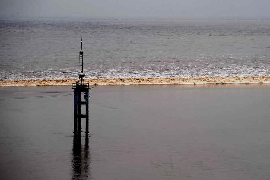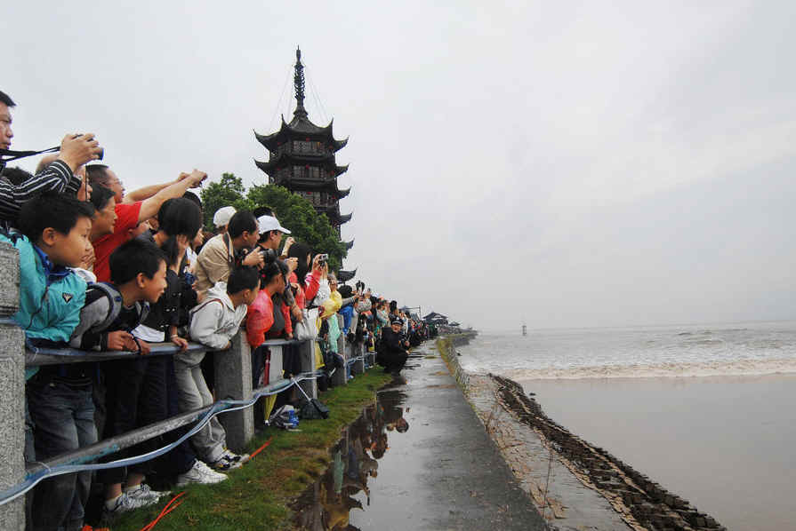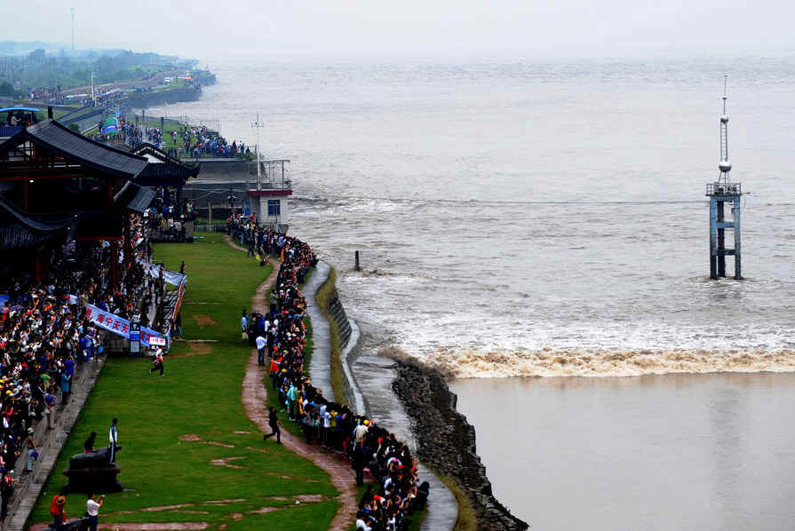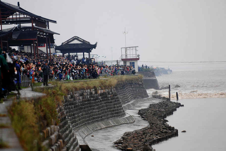 钱塘江现秋分"一线潮" 万人争睹潮扑岸