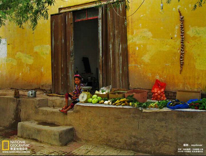 喀什小巷里的菜摊:暑假里的小女孩帮家里看着菜摊,在这里,人们习惯用的重量计量单位是”公斤“而不是”斤“。