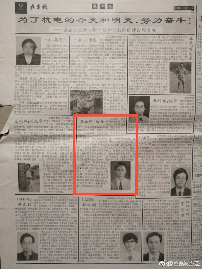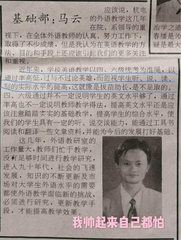 网友翻到一张1994年的报纸,居然有马云!他点评四六级考试“不应该以过不过论英雄”.....马爸爸,你知道自己又帅又超前吗?