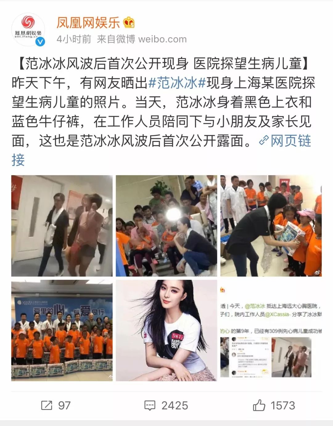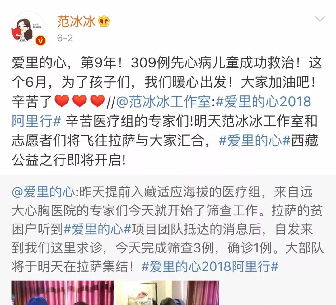 6月2日,范冰冰转发由她发起的公益活动“爱里的心”,微博写到,“爱里的心,第9年!309例先天病儿童成功救治!这个6月,为了孩子们,我们暖心出发!大家加油吧!辛苦了。”此后再无公开发声。
