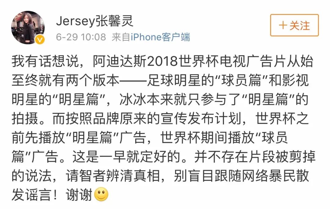 前两日有港媒报道,范冰冰为阿迪达斯拍摄了一组世界杯期间的广告,但是该广告在央视播出时,范冰冰的镜头全部被剪掉了。随后其工作室的员工给出了合理的解释进行辟谣:这个广告有两版,一版是球星版,一版是明星版,世界杯期间只播放球星版。可是有网友专门看了球星版之后发现,陈奕迅在、鹿晗也还在。