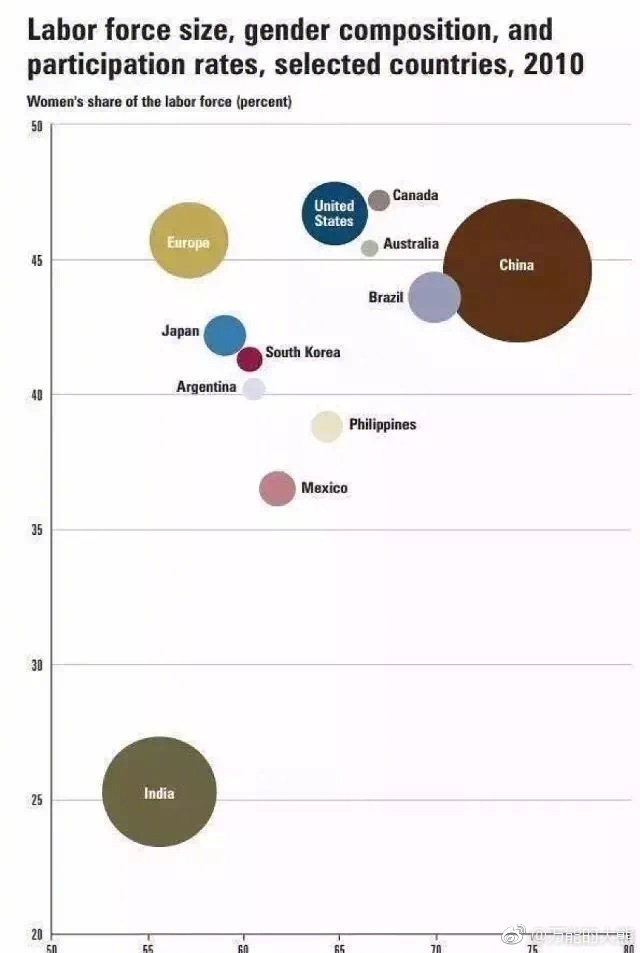 相比之下,美国只有65%,日本只有58%,而印度低至55%,差不多一半的国民选择待在家里,不出来工作。