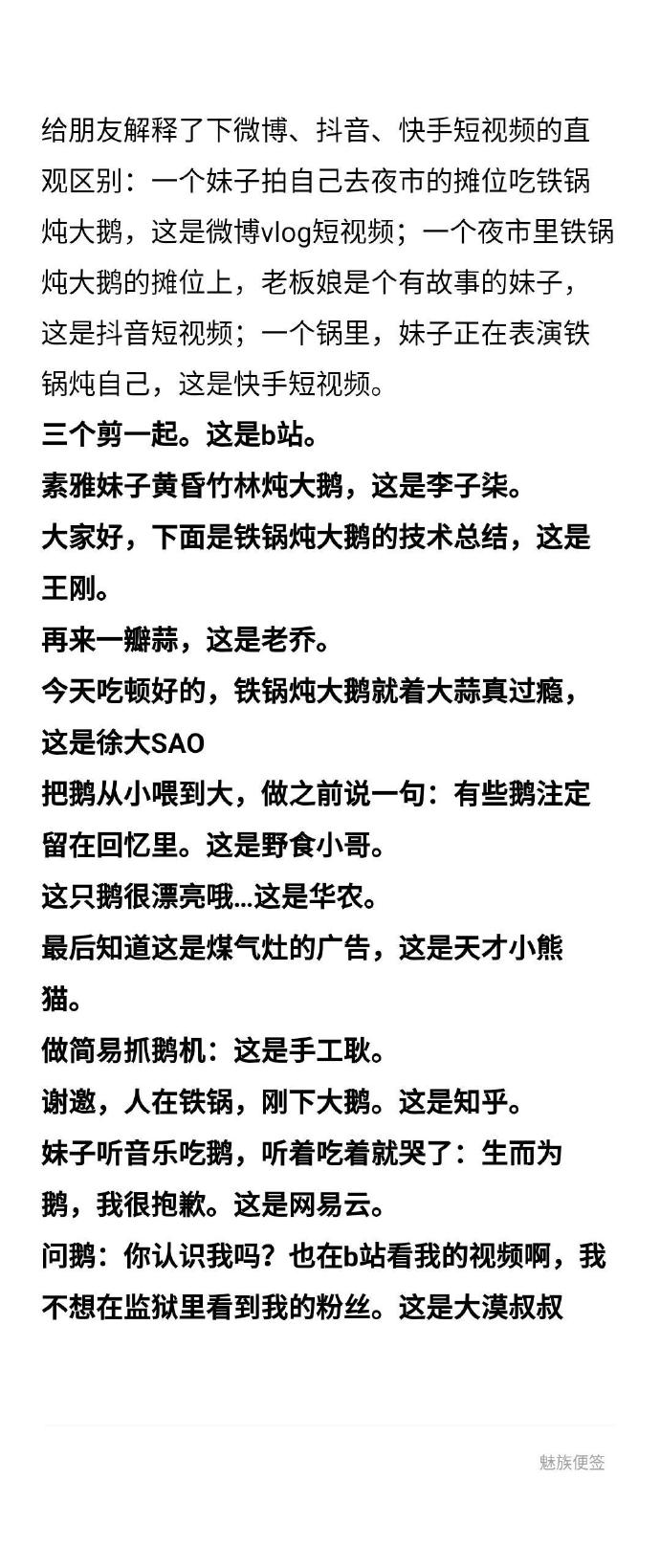 给朋友解释了下微博、抖音、快手短视频的直观区别:一个妹子拍自己去夜市的摊位吃铁锅炖大鹅,这是微博vlog短视频;一个夜市里铁锅炖大鹅的摊位上,老板娘是个有故事的妹子,这是抖音短视频;一个锅里,妹子正在表演铁锅炖自己,这是快手短视频。