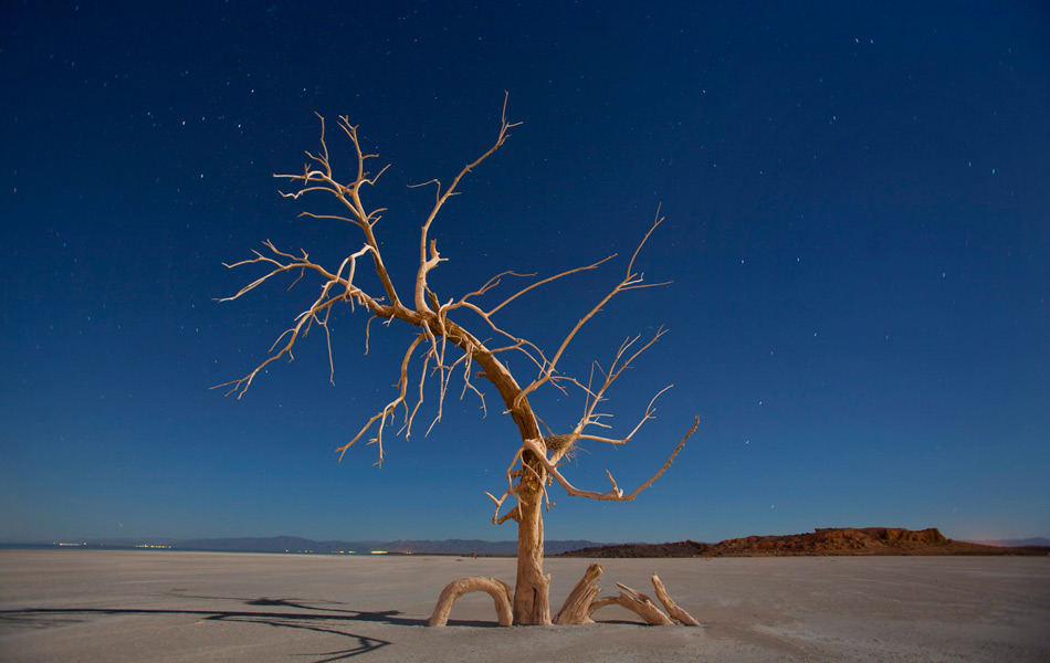 当地时间2011月1月20日,美国加州兰德附近,沙顿海南端的盐田里,满月光绘映照着一棵枯死的橡树。