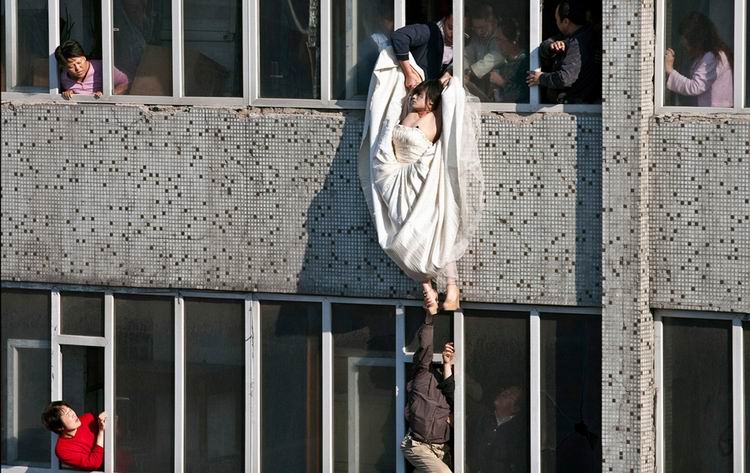 当地时间2011年5月17日15时,一名身穿婚纱的22岁女子坐在了长春市贵阳街与吴淞路交会处一栋居民楼七楼的窗台上,情绪异常激动。16时21分,女子突然纵身跳下。危急关头,长春市宽城区新发街道办事处主任郭中凡当空搂住了她的脖子,最终挽救了她的生命。郭中凡走下楼时,楼下围观的一名退伍老兵向他致以军礼,“你以前肯定当过兵,我谢谢你,你是纯爷们!” China Daily/供图