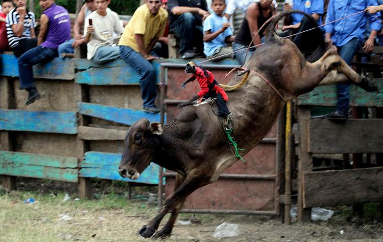 当地时间2011年1月16日,尼加拉瓜首都马那瓜北郊,当地的一个斗牛活动上,一只猴子骑在公牛背上表演。 Oswaldo Rivas/摄