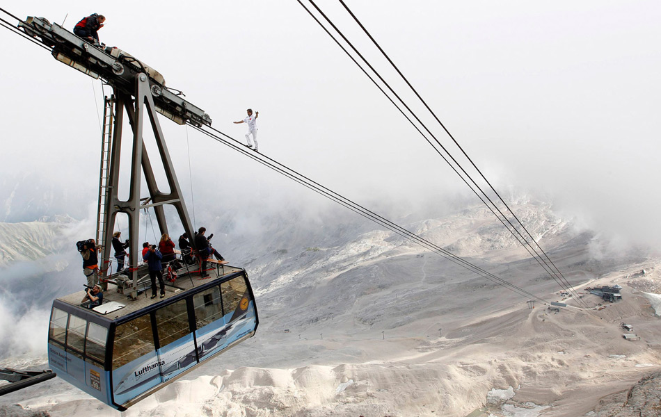 当地时间2011年8月20日,瑞士杂技表演者弗雷迪-诺克挑战德国南部最高峰楚格峰,在没有任何安全装备的保护下,他在山间的缆车钢丝绳上行走了约90分钟。 Michaela Rehle/摄