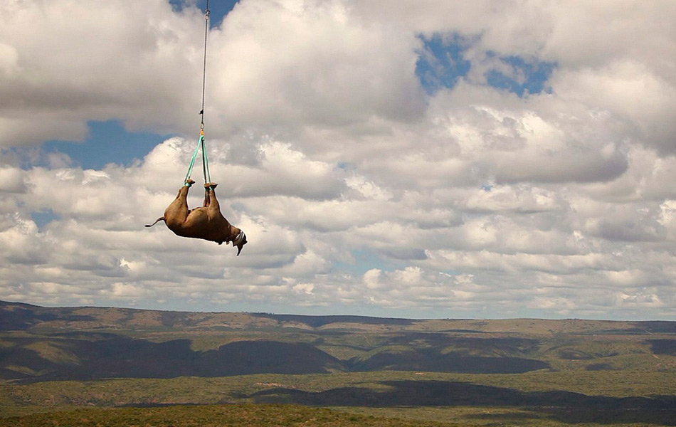 当地时间2011年11月8日,GreenRanaissance提供的一张图片显示,11月3日,南非军用直升机将被催眠的黑犀牛从南非偷猎严重的开普省东部山区运到15公里外林波波省的新家。这项活动由世界自然基金会组织。黑犀牛在南非某些公园和私人领地受到严重威胁,偷猎者为了犀牛角非法猎杀黑犀牛。 Green Renaissance/供图