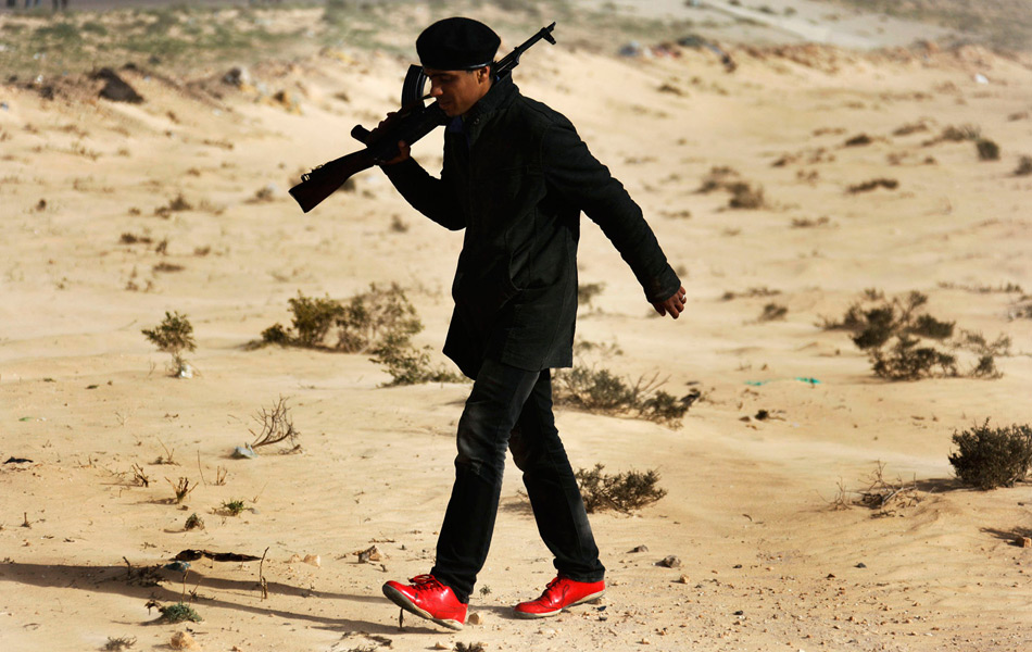 当地时间2011年3月21日,利比亚,一名反对派武装人员扛着武器走过艾季达比耶市郊。 Finbarr O'Reilly/摄