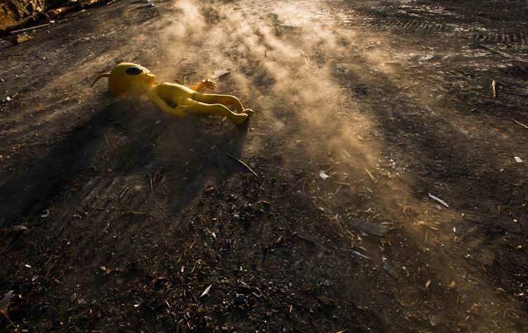 当地时间2011年4月5日,日本宫城县女川市,一个外星人玩偶被遗弃在尘土乱石堆中。 Dai Kurokawa/摄