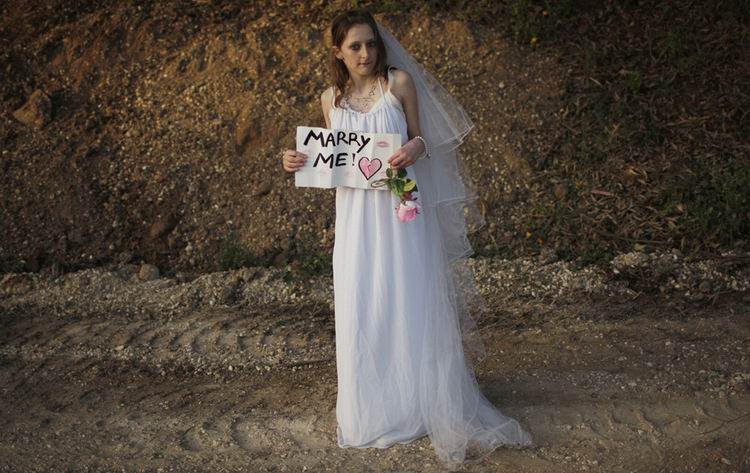 当地时间2011年4月14日,以色列特拉维夫,13岁的Hallel Goldamna——加拿大流行歌手贾斯丁.比伯的粉丝,身穿婚纱,手举“娶我吧”的标语,参加偶像的演唱会。 Ariel Schalit/摄