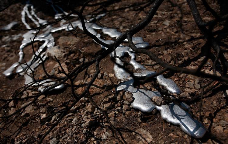 当地时间2011年4月26日,美国德克萨斯州,一处被烧毁的居民区前,金属在高热地表的炙烤下融化为液态。4月的德州山火至少烧毁了当地167户民居。 Tom Pennington/摄