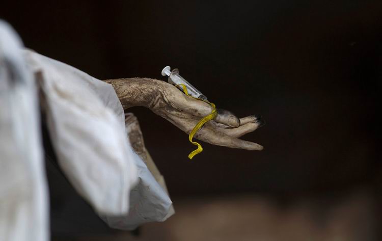 当地时间2011年5月16日,墨西哥杜兰戈,当地法院的一个临时陈尸所内,一具待辨别身份的尸体。5月12日,墨西哥北部杜兰戈州在路边发现8具男性无头尸。杜兰戈州贩毒分子活动猖獗,至今已在该州发现多个集体墓地,共挖出196具不明身份的尸体。 Dario Lopez/摄
